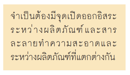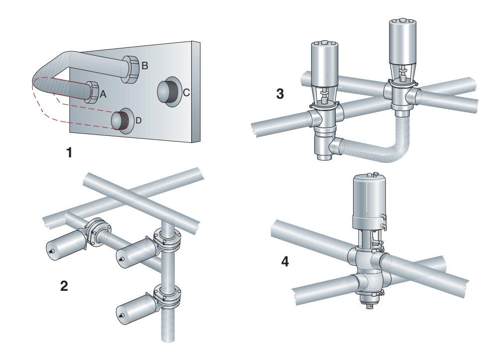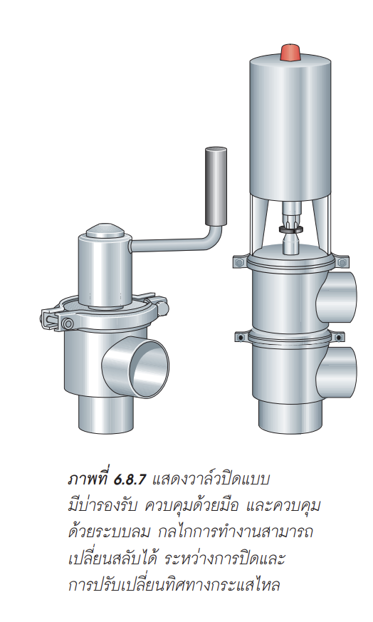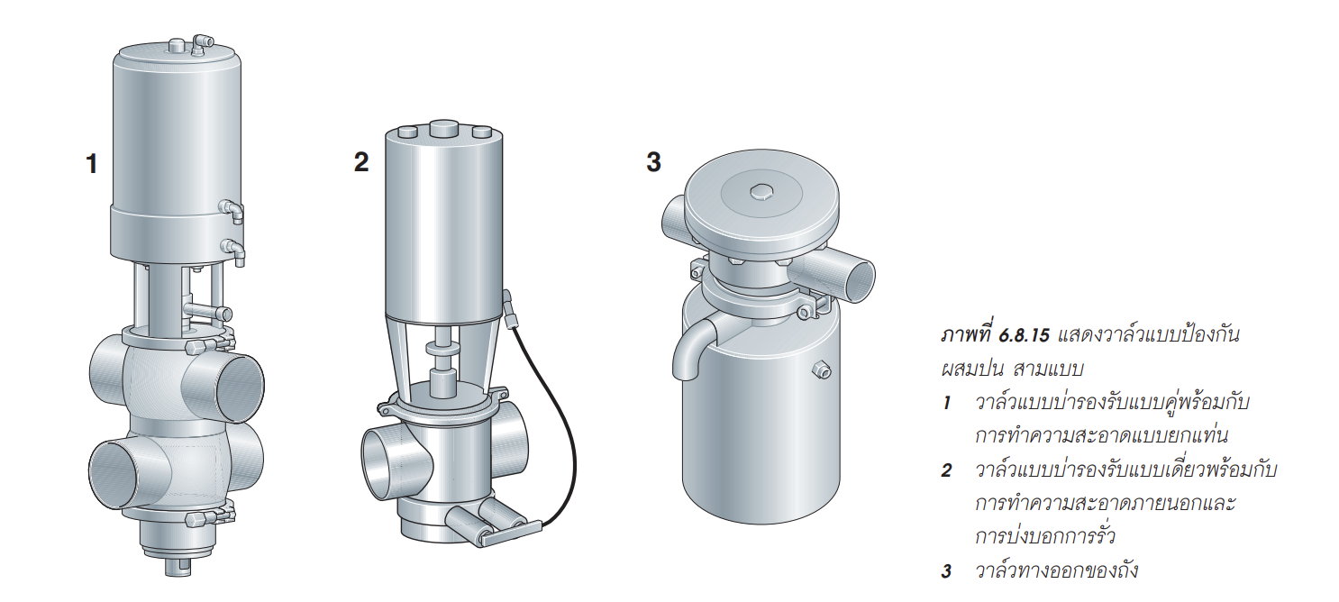 ในระบบท่อ จะมีจุดเชื่อมต่อมากมาย ที่ผลิตภัณฑ์จะต้องไหลผ่านส่วนหนึ่ง ไปยังส่วนอื่น แต่ในบางครั้งต้องปิดกั้น เพื่อให้สารต่างกัน สามารถไหลผ่านสองสายโดยไม่ผสมปนกัน เมื่อเส้นทางที่มาแยกต่างหากจากกันและกัน การรั่วไหลใดๆ จะต้องถ่ายทิ้งออกให้หมดสิ้น โดยไม่เปิดโอกาสให้สารปะปนกันได้ สิ่งนี้ เป็นปัญหาปกติที่พบเวลาติดตั้งเครื่องจักรในโรงงานผลิตนม ผลิตภัณฑ์นมและสารละลายทำความสะอาด ไหลในท่อแยกต่างหากจากกัน และต้องรักษาให้แยกจากกัน ภาพที่ 6.8.6 แสดงการติดตั้งวาล์วป้องกันการผสมปนกัน 4 รูปแบบ ซึ่งทำหน้าที่เหมือนกัน