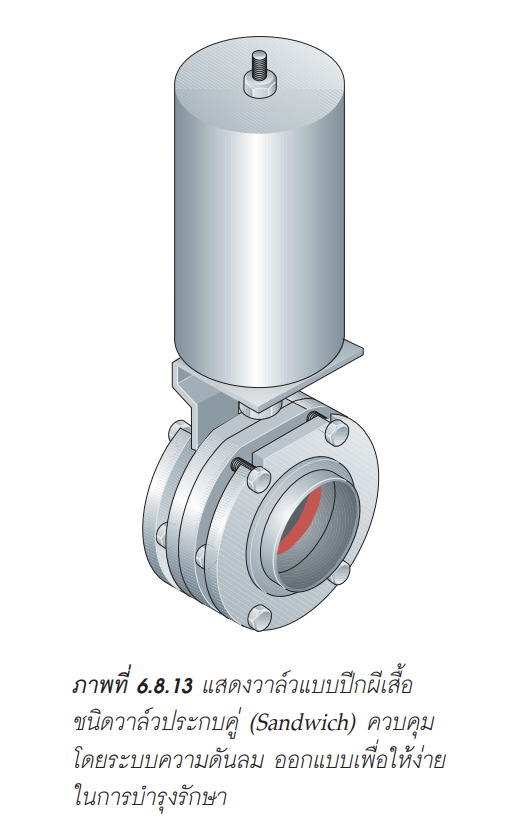 วาล์วแบบปีกผีเสื้อ ตามภาพที่ 6.8.11 เป็นวาล์วแบบปิด จะต้องใช้วาล์วสองหน่วยในการทำงานเพื่อเปลี่ยนกระแสไหล มักนิยมใช้วาล์วแบบปีกผีเสื้อ กับผลิตภัณฑ์ที่อ่อนไหว เช่น โยเกิร์ต และผลิตภัณฑ์นมที่ผ่านการหมัก เนื่องจากปัญหาการติดขัดในการผ่านวาล์วน้อย ส่งผลให้แรงดันตกน้อยมาก และไม่มีเกิดแรงปั่นป่วน รวมทั้งวาล์วชนิดนี้ยังทำงานได้ดีกับสารที่มีความหนืดสูง และเนื่องจากเป็นวาล์วทางตรง สามารถติดตั้งลงบนท่อตรงได้