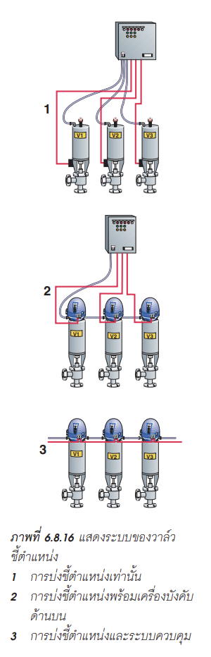 วาล์วอันหนึ่งสามารถติดตั้งได้กับเครื่องบ่งชี้ตำแหน่งหลายแบบ ดูภาพที่ 6.8.16 ประกอบ ขึ้นอยู่กับระบบควบคุมของโรงงาน มีสวิทช์ชนิดต่างๆ เช่น สวิทช์ขนาดเล็ก(Microswitches) Inductive Proximity Switches หรือ Hall Elements หน้าที่ของสวิทช์คือส่งสัญญาณสู่ระบบควบคุม