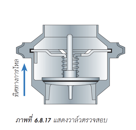 วาล์วตรวจสอบ ดังแสดงในภาพที่ 6.8.17 จะติดตั้งเมื่อมีความจำเป็นต้องป้องกันผลิตภัณฑ์จากการไหลไปผิดทิศทาง จะเปิดวาล์วทิ้งค้างไว้เมื่อกระแสไหลไปถูกทิศทาง ถ้ากระแสไหลหยุดลง แท่งเสียบวาล์วจะถูกแหนบสปริงดันสู่บ่ารองรับ นั่นคือวาล์วจะปิดเพื่อหยุดการย้อนกลับของกระแสไหล