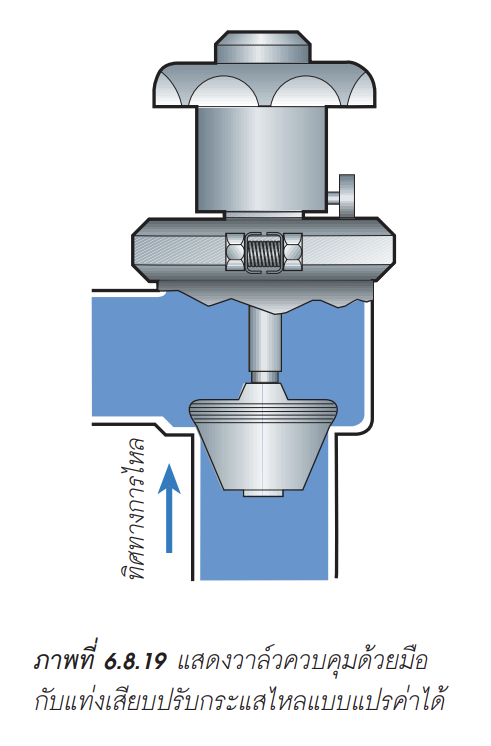 วาล์วควบคุมด้วยมือกับแท่งเสียบปรับเปลี่ยนกระแสไหลแบบแปรค่าได้ ตามภาพที่ 6.8.19 วาล์วชนิดนี้มีแท่งเสียบที่ออกแบบรูปร่างพิเศษ เมื่อหมุนปุ่มปรับ