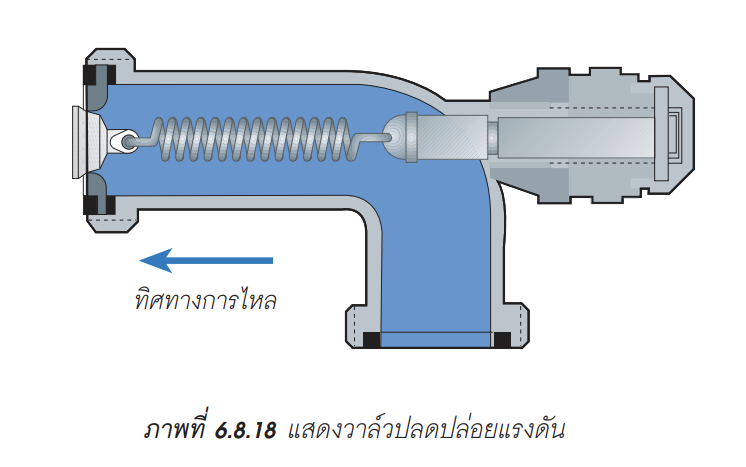 วาล์วปลดปล่อยแรงดัน ดังแสดงในภาพที่ 6.8.18 รักษาระดับแรงดันในระบบเมื่อความดันต่ำลง แหนบสปริงจะดันแท่งเสียบแนบกับบ่ารอง เมื่อความดันขึ้นสูงถึง