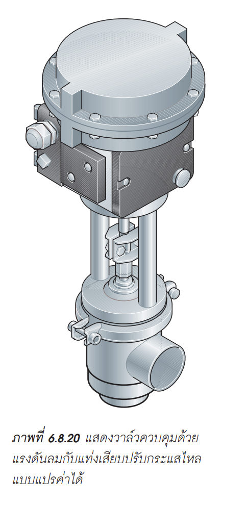 วาล์วควบคุมด้วยแรงดันลมกับแท่งเสียบปรับกระแสไหลแบบแปรค่าได้ ตามภาพที่ 6.8.20 ทำงานคล้ายกับวาล์วประเภทที่เพิ่งอธิบายไป การจัดตำแหน่ง