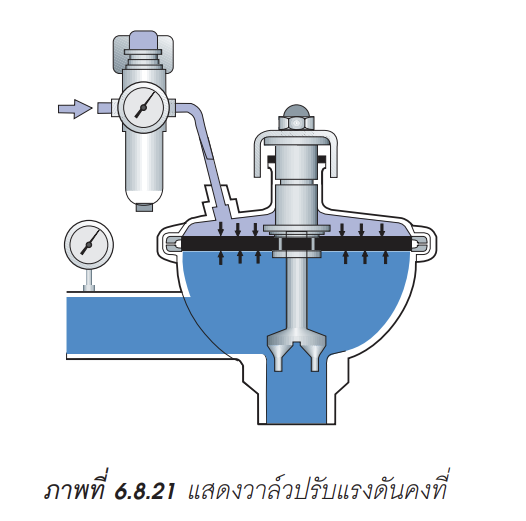 วาล์วที่มักนิยมใช้กันคือวาล์วปรับแรงดันคงที่ (constant-pressure valve) ตามภาพที่ 6.8.21 จะรับแรงดันอากาศผ่านทางวาล์วบีบอัดสู่ที่ว่างเหนือแผ่น แรงดันอากาศปรับได้โดยวาล์วบีบอัดจนกระทั่งเครื่องวัดความดันผลิตภัณฑ์แสดงค่าความดันที่ต้องการ ดังนั้นจะเป็นการรักษาแรงดันที่ตั้งค่าไว้แล้วให้คงที่โดยไม่สนใจการเปลี่ยนแปลงเงื่อนไขการทำงานอื่นๆ ภาพที่ 6.8.22 แสดงการทำงานของวาล์วปรับแรงดันคงที่