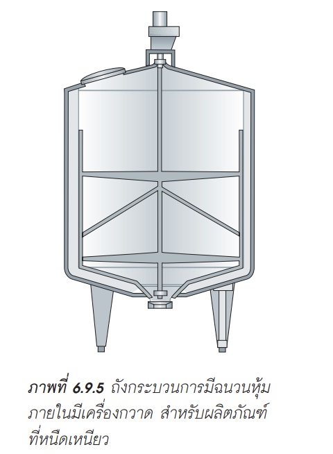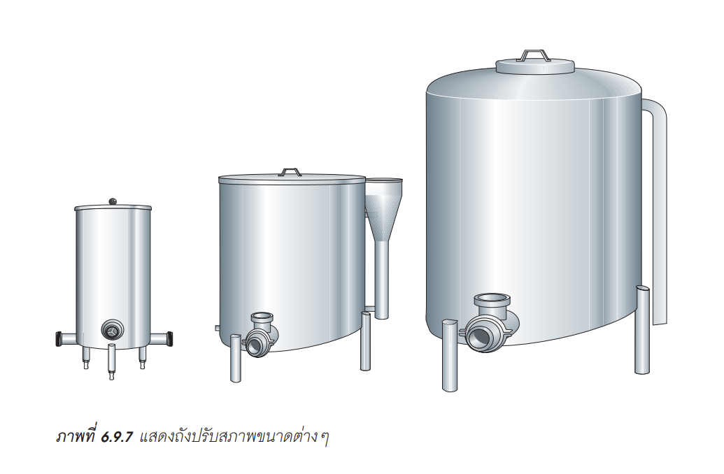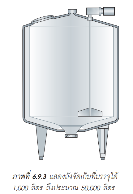 ถังจัดเก็บตามภาพที่ 6.9.3 สำหรับกำลังการผลิตที่ 1,000 ถึง 50,000 ลิตรผนังด้านในเป็นเหล็กสเตนเลส หุ้มด้วยฉนวนเพื่อรักษาอุณหภูมิของผลิตภัณฑ์ให้คงที่ ในกรณีนี้ ผนังด้านนอกก็เป็นเหล็กสเตนเลส และมีเส้นใยฉนวนระหว่างชั้นทั้งสอง