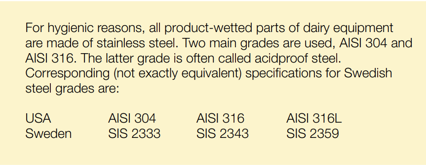All components in contact with the product are made of stainless steel. Various materials are used in the other systems, e.g. cast iron, steel, copper and aluminium. Plastic is used for water and air lines, and ceramic for drainage and sewage pipes.