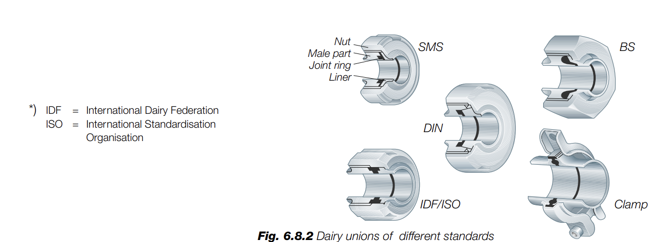 Different countries have different union standards. These can be SMS (Swedish Dairy Standard) also used internationally, DIN (German), BS (British), IDF/ISO* and ISO clamps (widely used in the US).