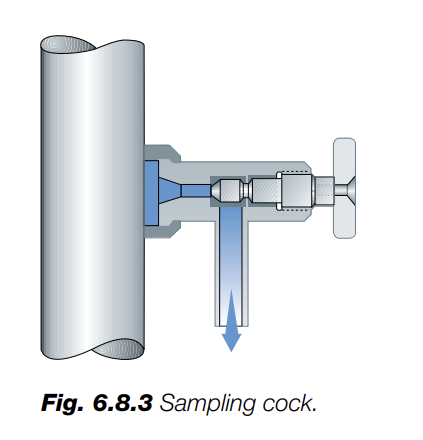 Sampling devices need to be installed at strategic points in the plant to collect product samples for analysis. For quality control, such as determining the fat content of milk and the pH value of cultured products, the samples can be collected from a sampling cock, figure 6.8.3.