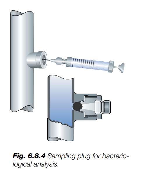 For hygienic quality tests, the sampling method must preclude any risk of contamination from outside the pipe. A sampling plug can therefore be used. This plug, shown in figure 6.8.4, has a rubber bung at the bottom. The plug is first removed and all parts that could contaminate the sample are sterilised (typically a wad moistered in a chlorine solution just before sampling), after which the needle of a hypodermic syringe is inserted through the bung into the product, and a sample is withdrawn.